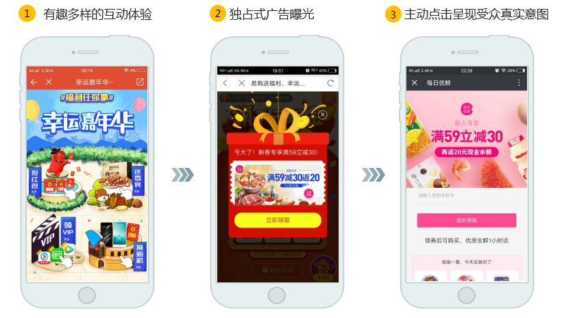 艾得互動廣告以幾百種不同趣味廣告形式為主,在每個app首頁、發(fā)現(xiàn)頻道等放置廣告入口,點擊即可進(jìn)入活動頁面,用戶有多次抽獎機會,將廣告主的優(yōu)惠券、紅包、VIP特權(quán)等設(shè)置為其中一個獎品,根據(jù)用戶的活躍程度、以往的行為偏好、使用的手機型號(安卓或iOS)、IP所在城市等一系列用戶畫像進(jìn)行匹配,當(dāng)屬性匹配的用戶抽獎時,會抽中對應(yīng)獎品,完成一輪廣告投放。