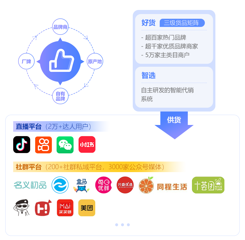 好貨興選是智慧零售解決方案的重要組成部分。平臺背靠億瑪在AI、大數(shù)據(jù)以及云計算等方面的技術(shù)積累,一頭連接眾多品牌商,同時整合優(yōu)質(zhì)源頭供應(yīng)鏈資源,另一頭連接全網(wǎng)具有流量能力的網(wǎng)紅/社群等新媒體B端用戶,形成“好貨+智選”的差異化競爭優(yōu)勢,提供智能供應(yīng)鏈賦能服務(wù)。
