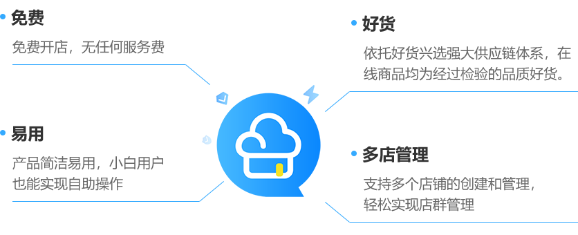 好貨云店借助好貨興選SAAS服務,從而提升新媒體流量渠道電商變現(xiàn)效率與收益。強大的供應鏈能力,為有流量的網(wǎng)紅/社群等新媒體B端用戶提供免費一鍵開店。
